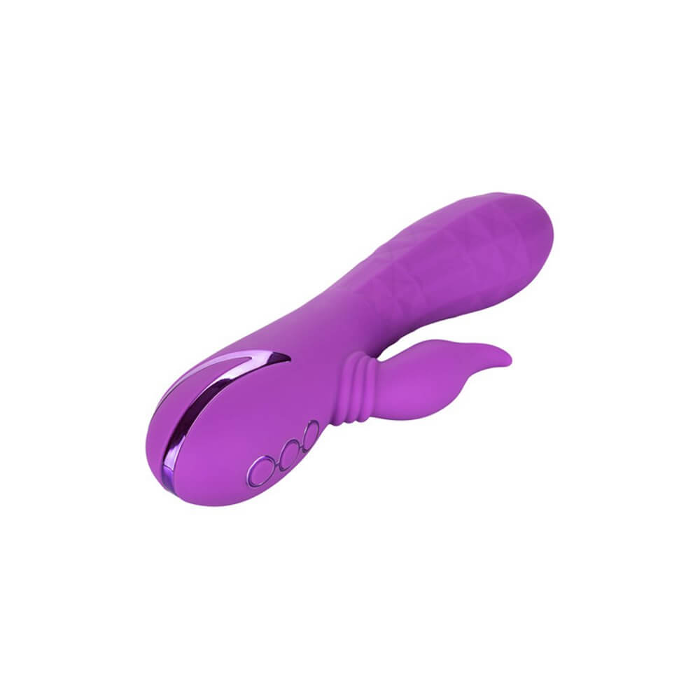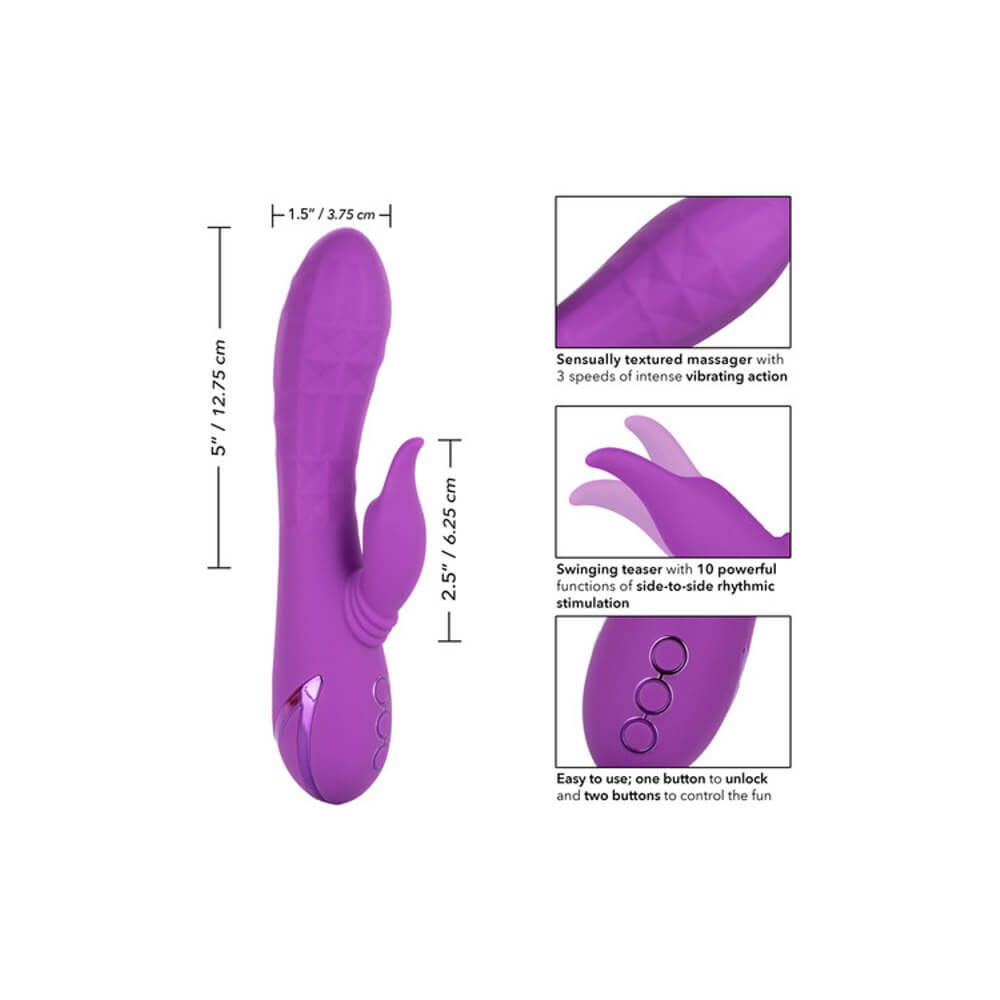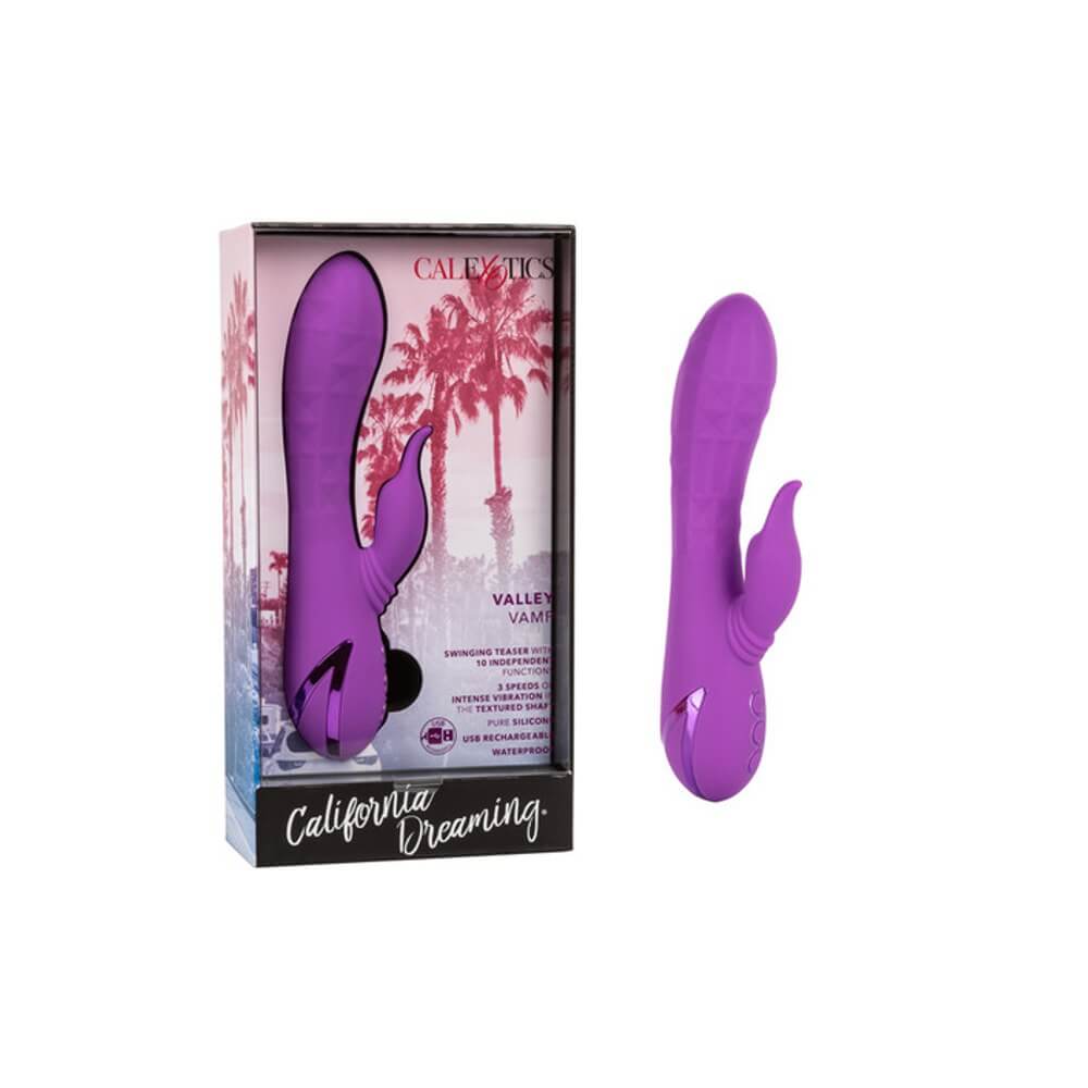 Give yourself over your wildest fantasies and indulge in true pleasure with the vivacious California Dreaming® Valley Vamp. The luxurious rabbit vibrator has a one-of-a-kind side-to-side rhythmic stimulator for mind-blowing external stimulation. Experience pleasure like never-before with the unique swinging teaser and 3 speeds of shaft vibrations.