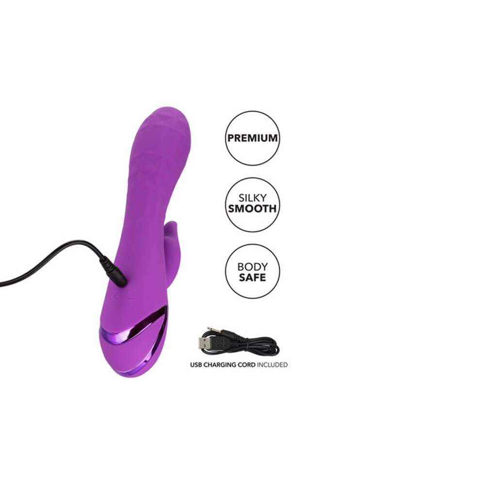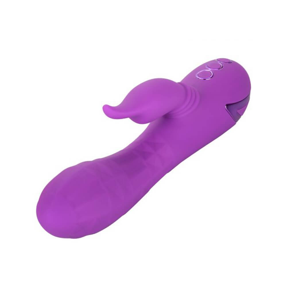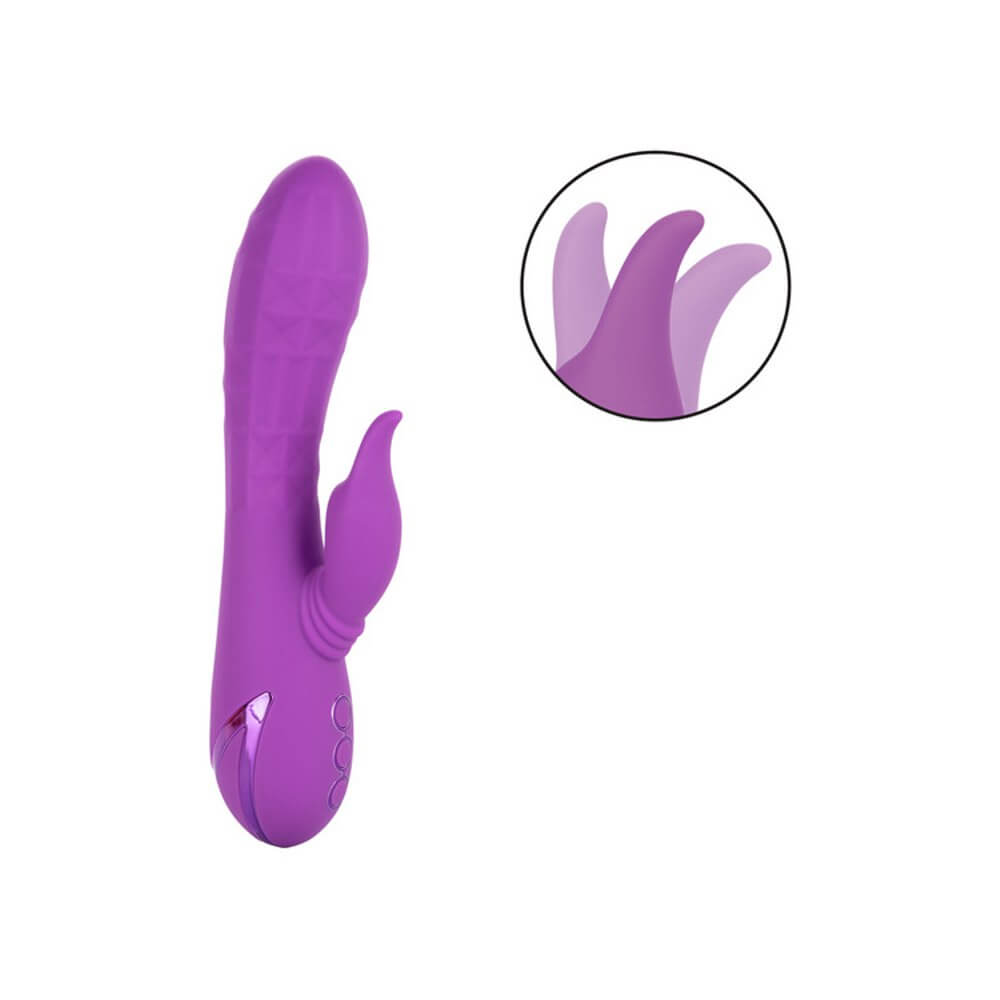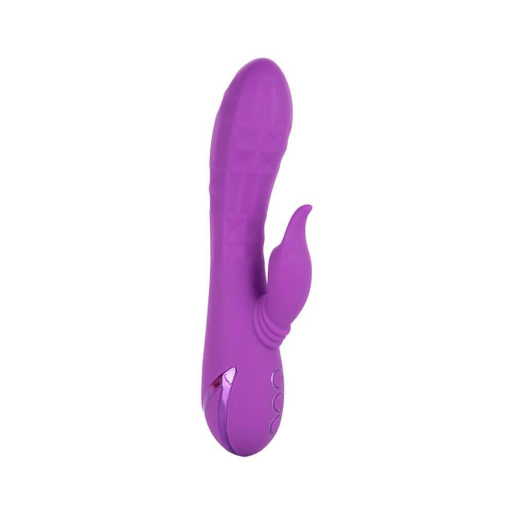 Give yourself over your wildest fantasies and indulge in true pleasure with the vivacious California Dreaming® Valley Vamp. The luxurious rabbit vibrator has a one-of-a-kind side-to-side rhythmic stimulator for mind-blowing external stimulation. Experience pleasure like never-before with the unique swinging teaser and 3 speeds of shaft vibrations.